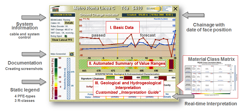 BEAM INTEGRAL user interface: e.g. simultaneously indication of BEAM forecast results on a monitor placed outside the tunnel; BEAM results indicate a cavity zone of about 2m thickness and medium water content in a distance of about 4m ahead of the face yet, whereby the first detection was shown in a distance of 3-times the tunnel diameter which means 20 m ahead of the face in this example.