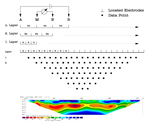 Data acquisition is performed by using multi-electrode configurations along profile lines. Thhereby the "intellegent" electrodes are automatically steered to combine different current injection points (A, B) and voltage measuring (M, N).