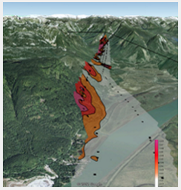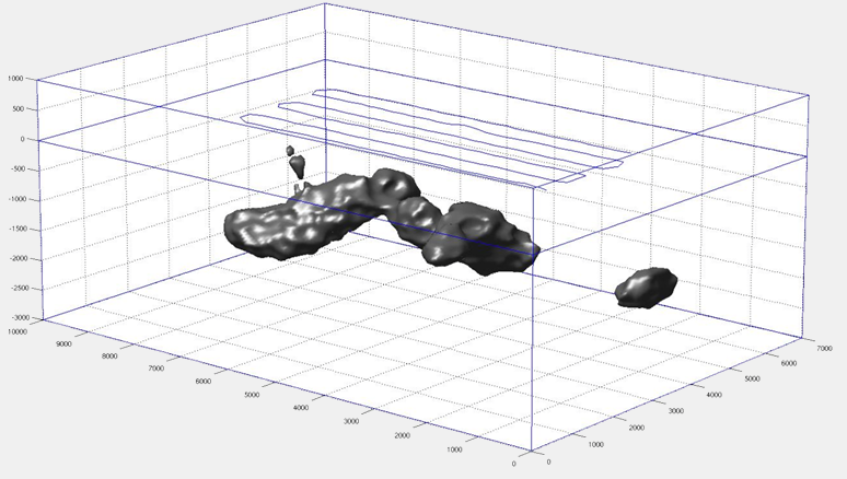 3D visualisation of results with depth isoline plots of core anomaly zones