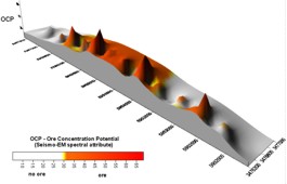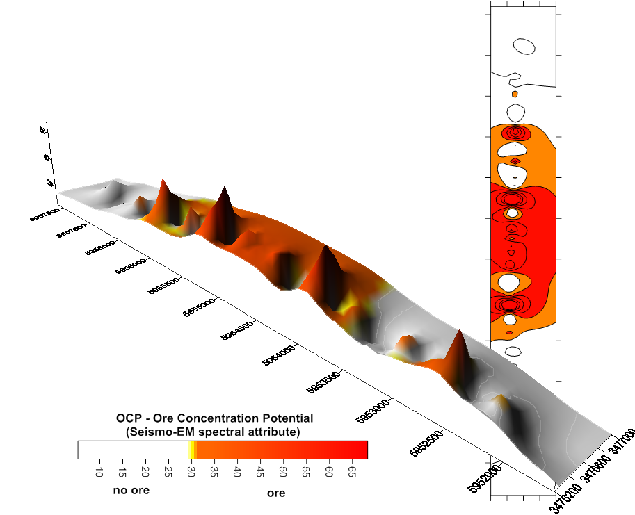 From data acquisition and data processing the distribution of the seismo-EM spectral attribute OCP (Ore Concentration Potential) is obtained.